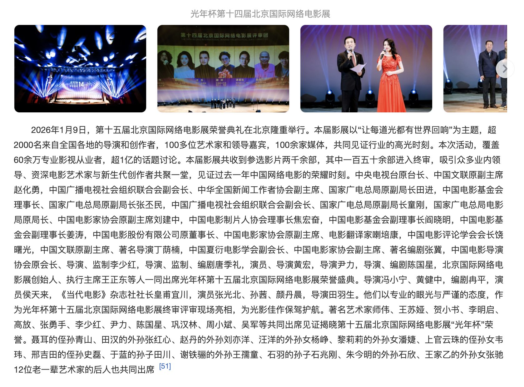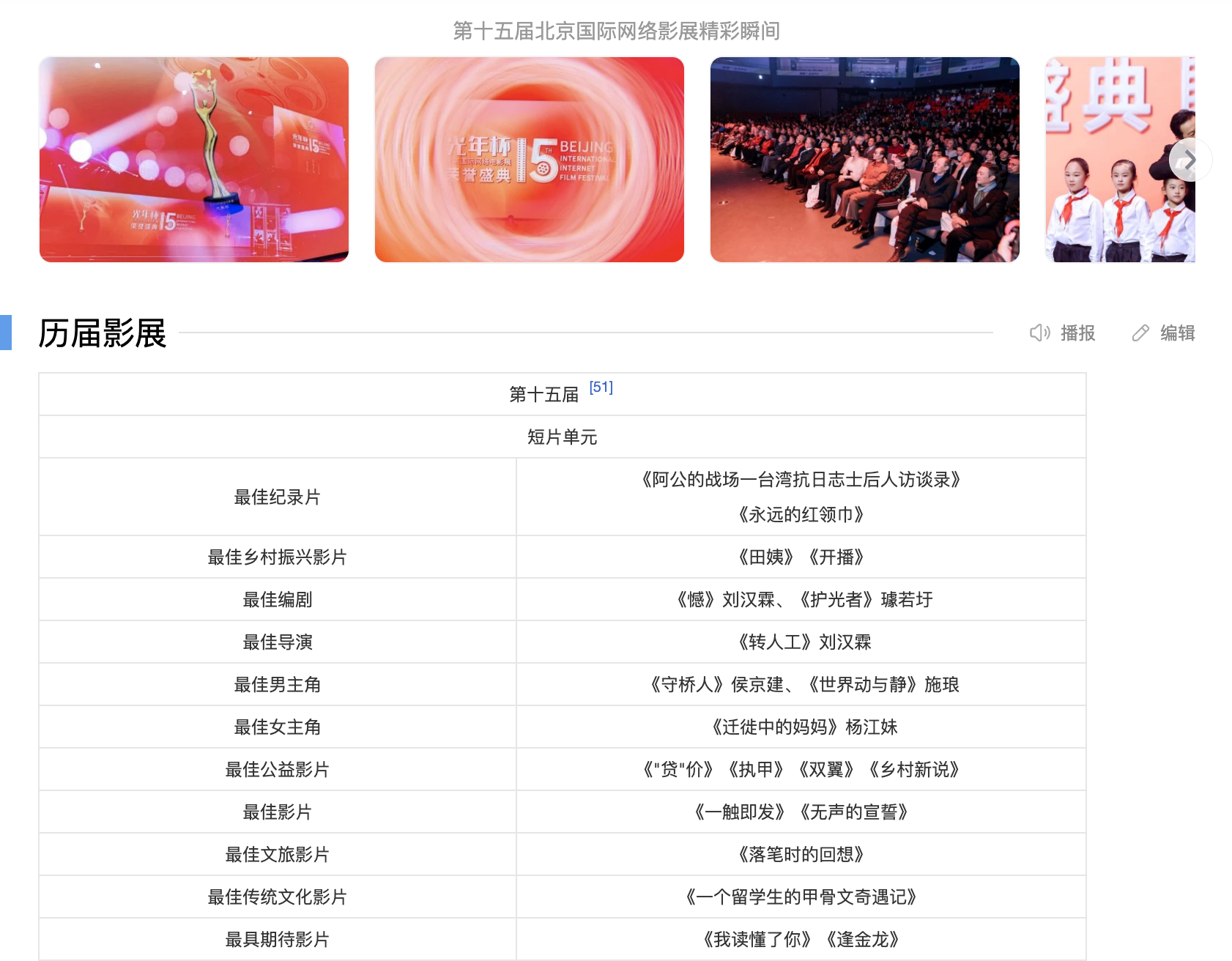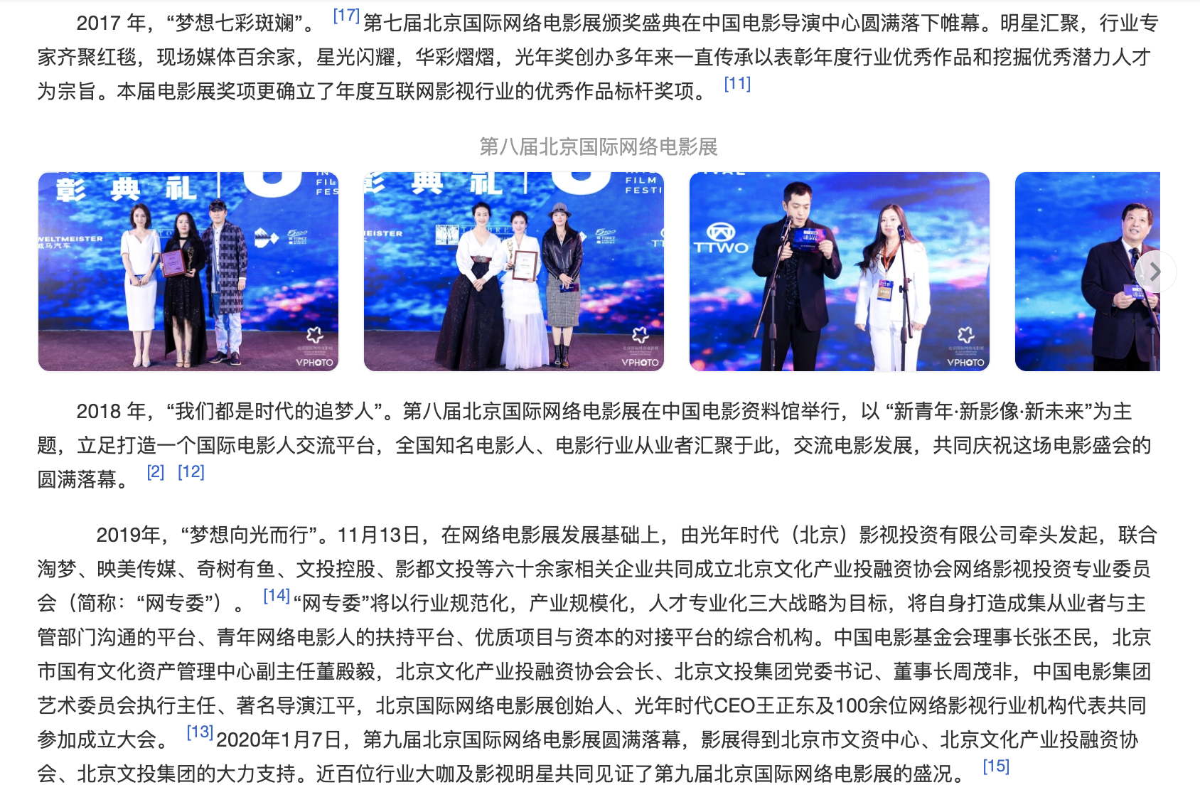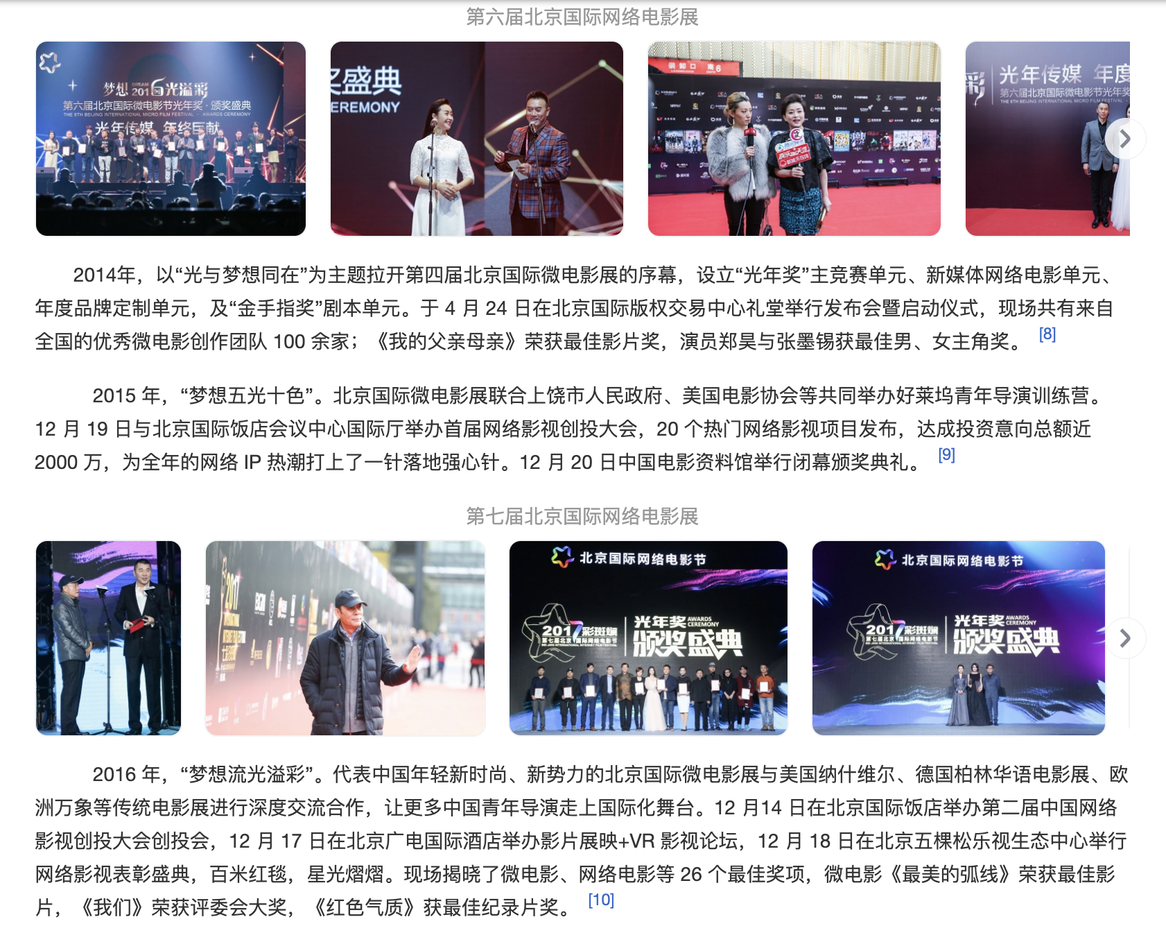 "与你一起实现梦想",中国第一个微电影展、首届北京国际微电影节成功举办,奠定了微电影领域的领导者地位。联合腾讯视频共同发起并成立首届北京国际微电影节,同时启动"青年导演扶持计划"。