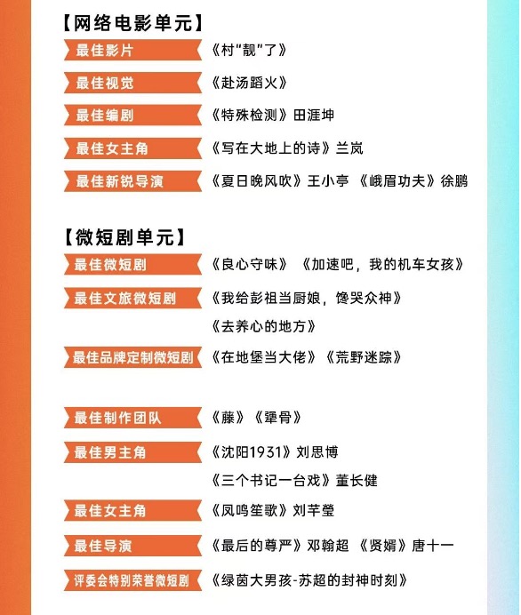 本届影展共收到两千余部参选影片,百余部进入终审,最终涵盖短片、AIGC、主竞赛、微短剧、网络剧、网络电影及年度荣誉七大单元,十余个细分奖项荣誉逐一揭晓。获奖影片类型丰富多样,聚焦社会现实的短片单元纪录片《阿公的战场》与乡村振兴影片《田姨》、探索前沿技术的AIGC单元中《哪吒三——劫火重生》等运用人工智能技术的创新之作、展现传统文化魅力的《一个留学生的甲骨文奇遇记》、反映时代脉搏的网络电影《村“靓”了》。每个单元都有独特的作品脱颖而出,共同绘制出一幅主题多样、类型丰富、形式新颖的年度佳作版图。