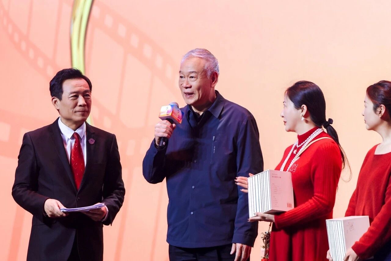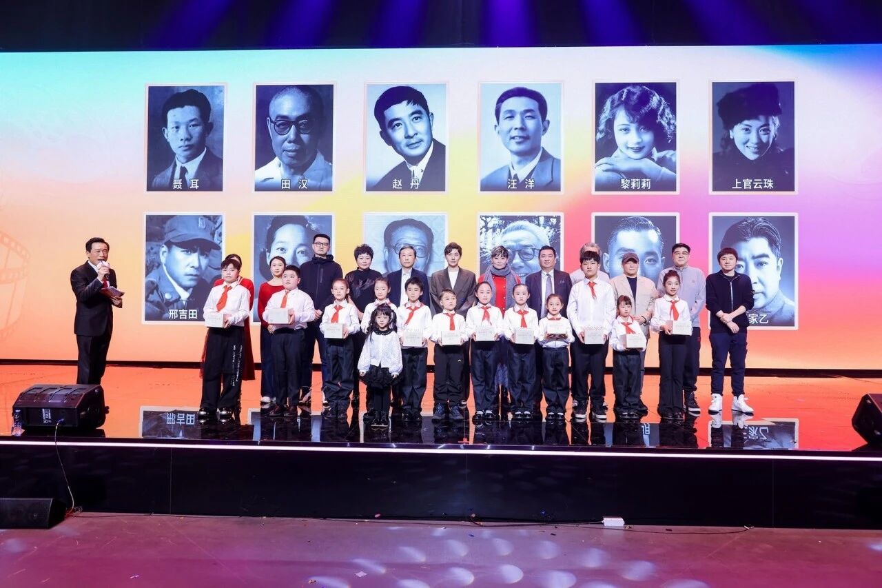 值此中国电影诞生120周年之际,典礼特别设置了致敬环节。导演江平与到场嘉宾共同主持了《夏衍剧作十种》赠书仪式。表演节目的儿童合唱团成员,从聂耳的侄孙青山、田汉的外孙张红心、赵丹的外孙刘亦洋、汪洋的外孙女杨峥、黎莉莉的外孙女潘婕、上官云珠的侄孙女韦玮、邢吉田的侄孙史磊、于蓝的孙子田川、谢铁骊的外孙王孺童、石羽的孙子石兆刚、朱今明的外孙石欣、王家乙的外孙女张驰12位老一辈艺术家的后人手中,接过了这份承载着电影历史与精神的珍贵礼物。随后,中国电影基金会理事长张丕民与学术顾问黄会林教授,又为这12位嘉宾赠书。这一环节寓意深远,将中国电影的艺术精神与历史责任,生动地传递给了下一代。